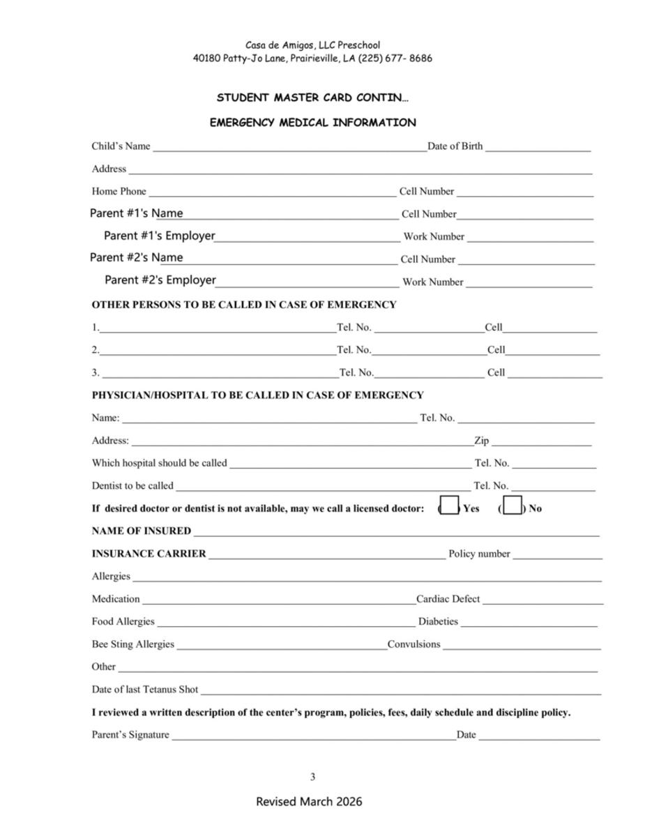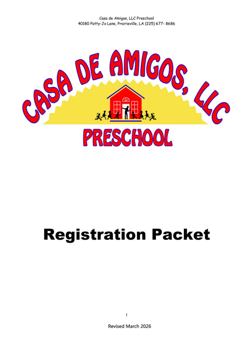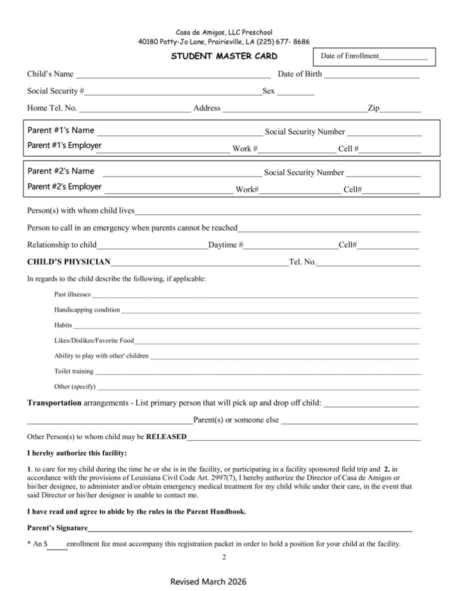 A $100 enrollment fee must accompany this registration packet in order to hold a position for your child at the facility.